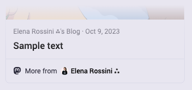 What does it mean? That preview links to articles shared on the Fediverse - you know, those fancy cards with image and blog excerpts - now display a new item: "more from: _" with the name of the author, their avatar and a link to their Mastodon profile. Like this: