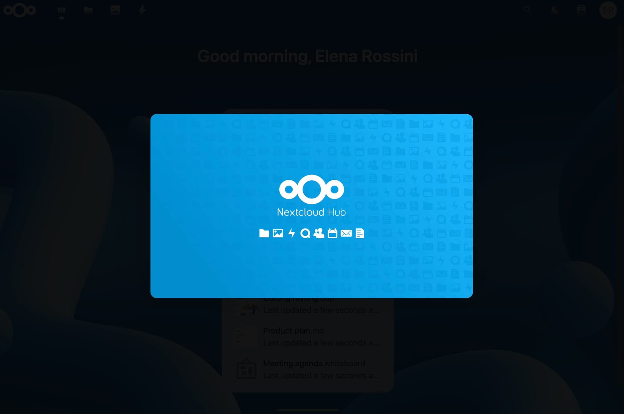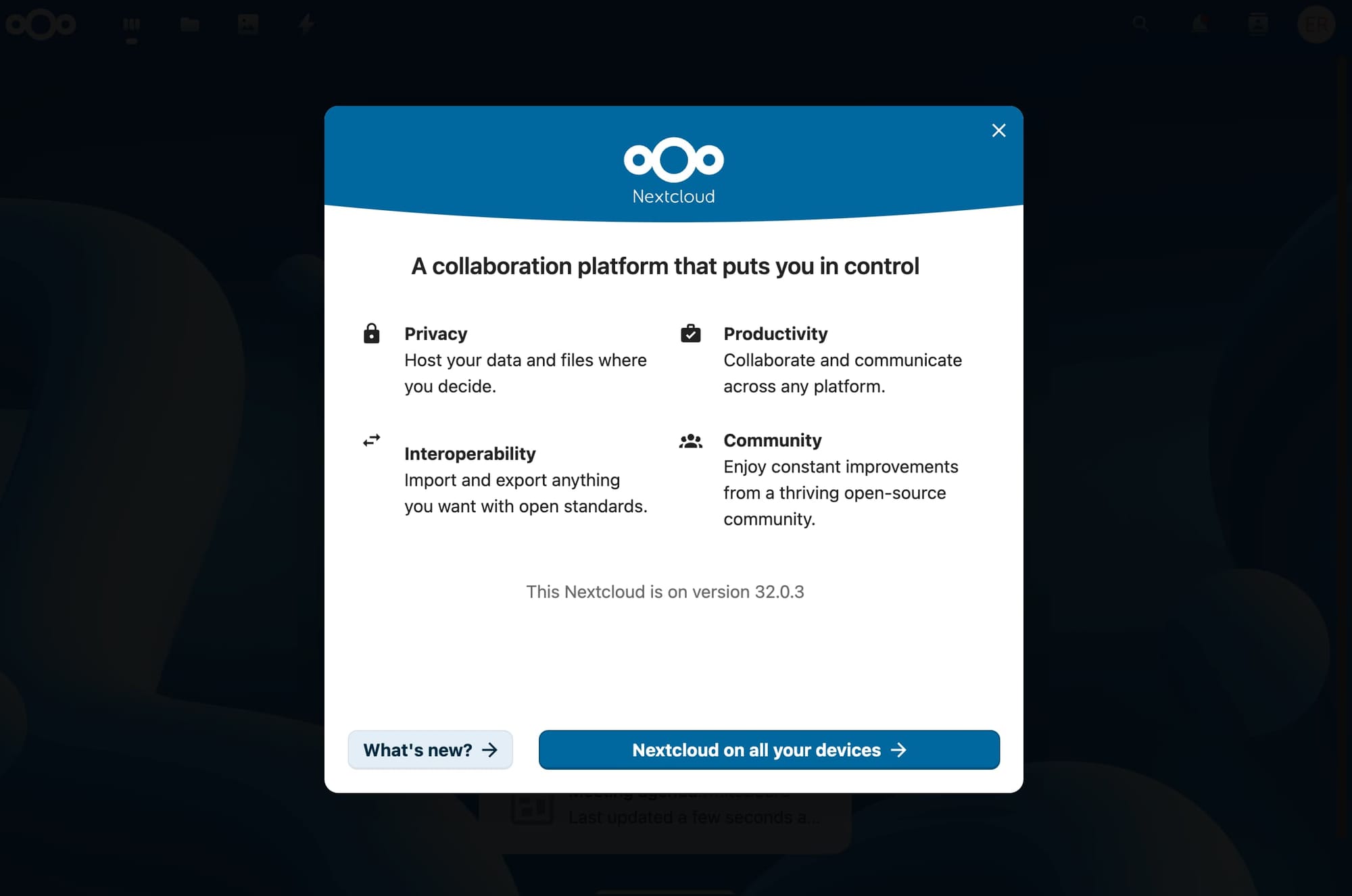 NextCloud then offers you a quick orientation to show some of its latest features. You can skip through the steps or watch the videos - up to you: