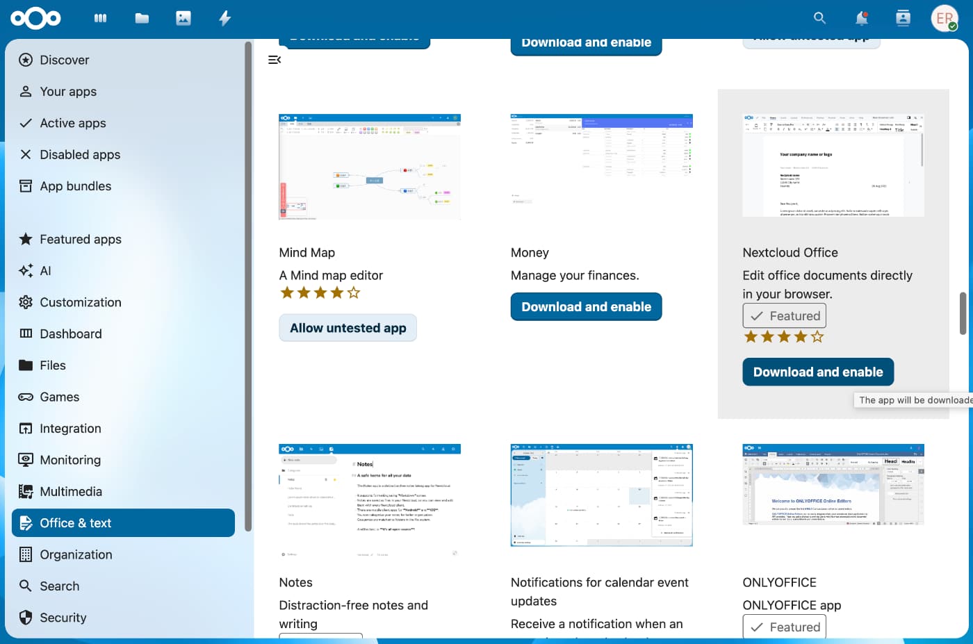 If you click on a category - let's say "office & text" - you can find useful add-ons like NextCloud office, which allows you to create, edit and share documents directly in your browser. All you have to do is to click on the "Download and enable" button.