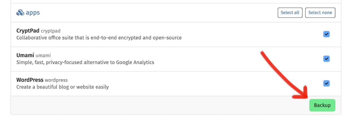 When you click on "New Backup" you will be presented with a long list of things hosted on your server that you can choose to include or exclude from your backup. I typically back up my ENTIRE instance, leaving every box checked.