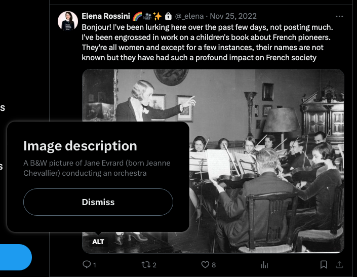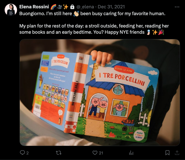 P.S.: while I was in the process of writing this piece I realized how my Mastodon display name was potentially an accessibility nightmare. A screen reader would have read it as “asterism symbol, Elena Rossini, asterism symbol, pencil emoji, sparkles emoji, camera emoji” - so I ended up changing it and only kept one asterism symbol after my name. Apologies if the previous display name made reading my toots with a screen reader difficult.