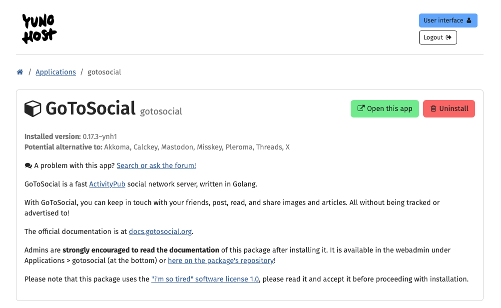 This article is NOT a step-by-step guide of how to use YunoHost and install GoToSocial. Maybe I will do that in the future. No, I really want to make GoToSocial shine here, so I will speed-run through the installation steps.