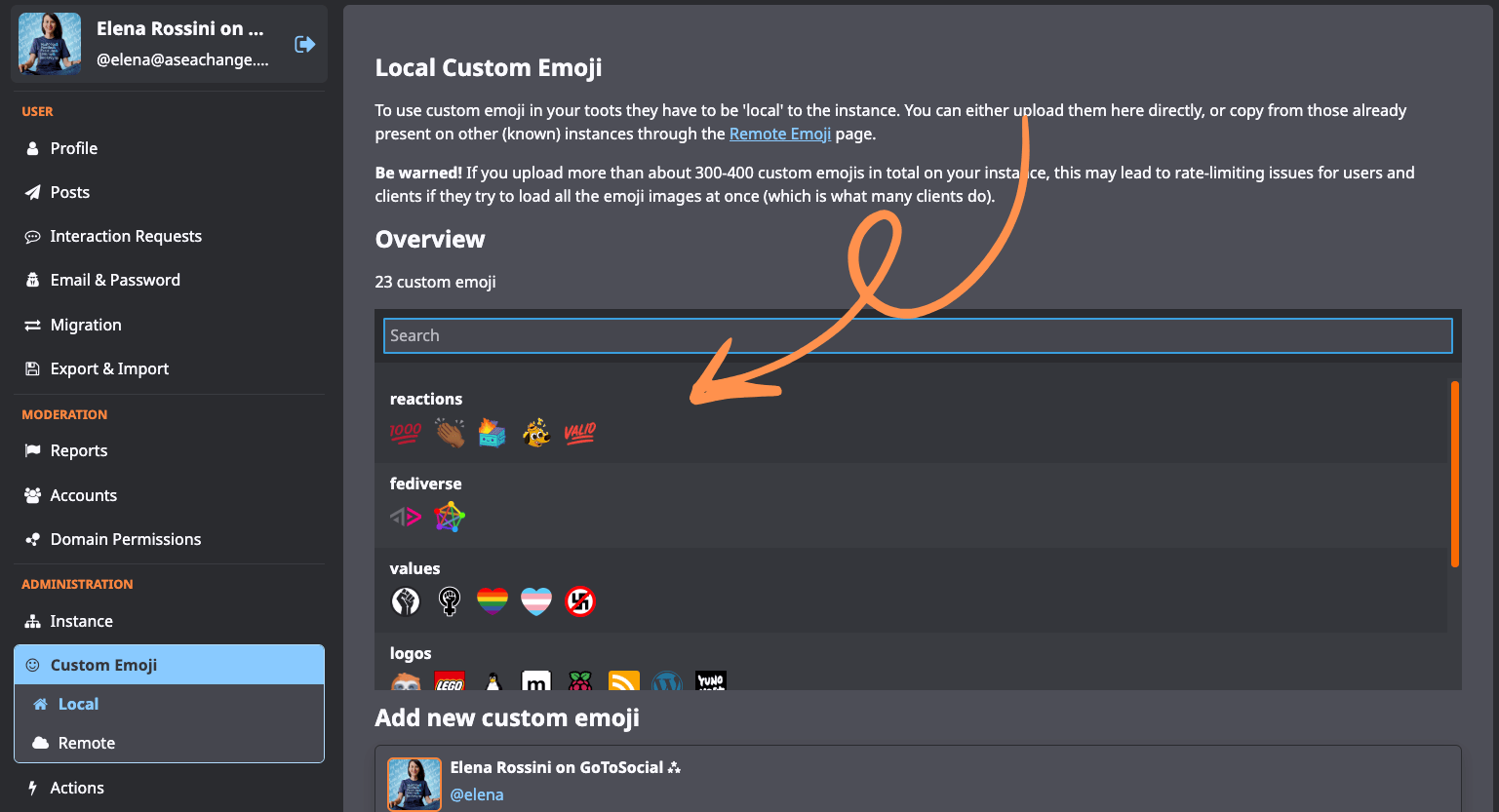 The website emojos.in allows you to peruse the emojis used by any given Fediverse instance - and download any you may like. When you log onto your GoToSocial server as an admin, you can find a “Custom Emojis” page in the sidebar. There, you can upload any custom emoji of your liking and even organize them by topic. This is what I did: