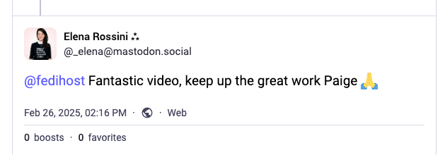 Now, I really enjoyed FediHost's video and I’d like to comment on it, giving a shout-out to the host Paige. In the world of Big Tech’s closed silos, I would have to create an account on the platform hosting the video in order to like, comment or follow a creator - even if I have no plans to ever upload any videos. This is the case on YouTube and Vimeo but not on the Fediverse because of the magic of ActivityPub.