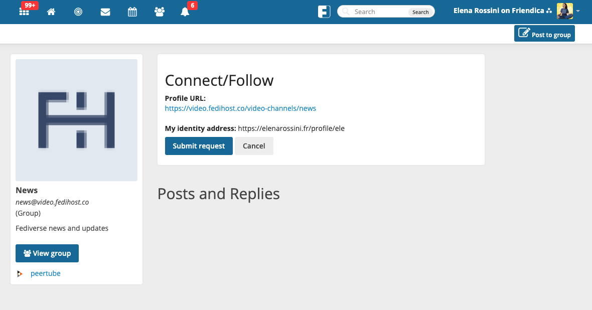 For the purposes of this exercise, I will use my Friendica account (to show that these actions work across various Fediverse software). So I click on Subscribe and enter @ele@elenarossini.fr (my Friendica username). When I press “Remote Subscribe” I am redirected to my Friendica page and all I have to do is click on “Submit Request” (that’s the jargon of Friendica, on Mastodon the same button would read « subscribe »).