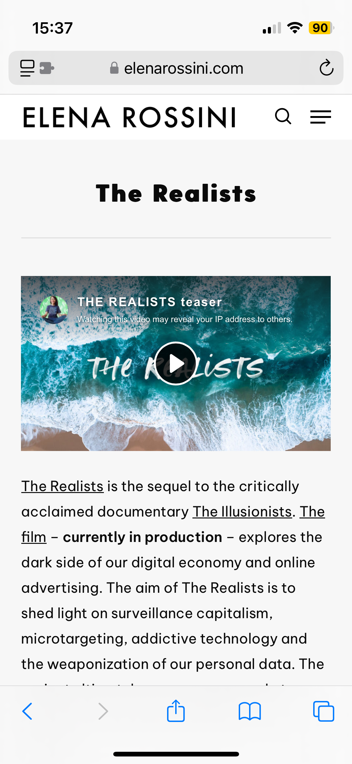 a screenshot of my website with the PeerTube video player embedded on the page for my project The Realists. shown on desktop (left) and mobile (right)