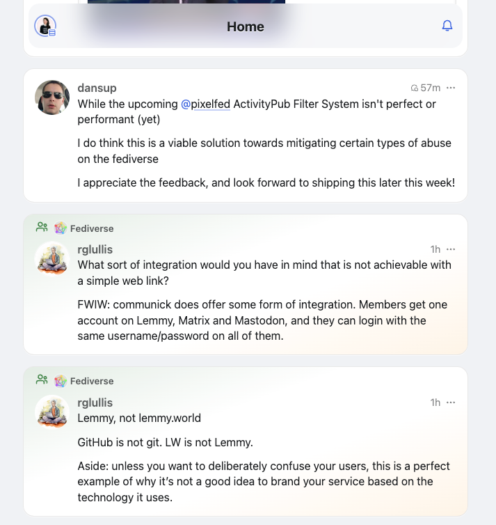 I was positively surprised by how well Mastodon AND Pixelfed communicated with the Fediverse’s content aggregators, with comments and mentions synching seamlessly between these projects. I was particularly impressed by Pixelfed because - for now - it’s a photo sharing site. I’m saying "for now" because its developer @dansup shared plans about the upcoming “Pixelfed Groups”: