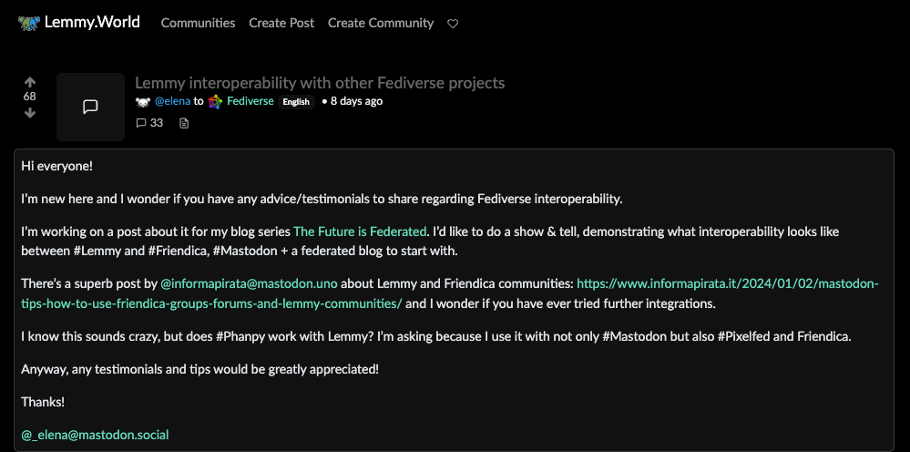 What disappointed me about content aggregators and interoperability (and I’m ready to face pitchforks because of its devoted following) was Friendica. No mentions on posts from other platforms (Lemmy, PieFed, Mbin) or even reply mentions showed up in Friendica. Nothing.