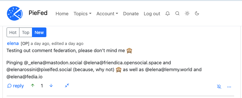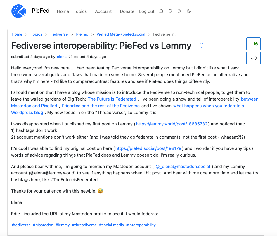 After sharing some of my frustrations with Lemmy interoperability tests, I got recommendations to try out the new Fediverse content aggregator project PieFed - which is only a year old, but showing a lot of promise. And so I signed up for it, determined to test Fediverse interoperability on it.