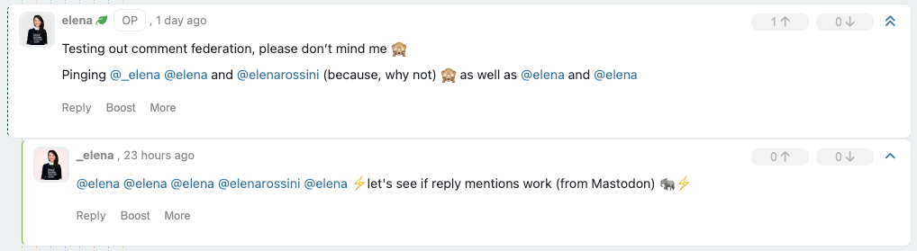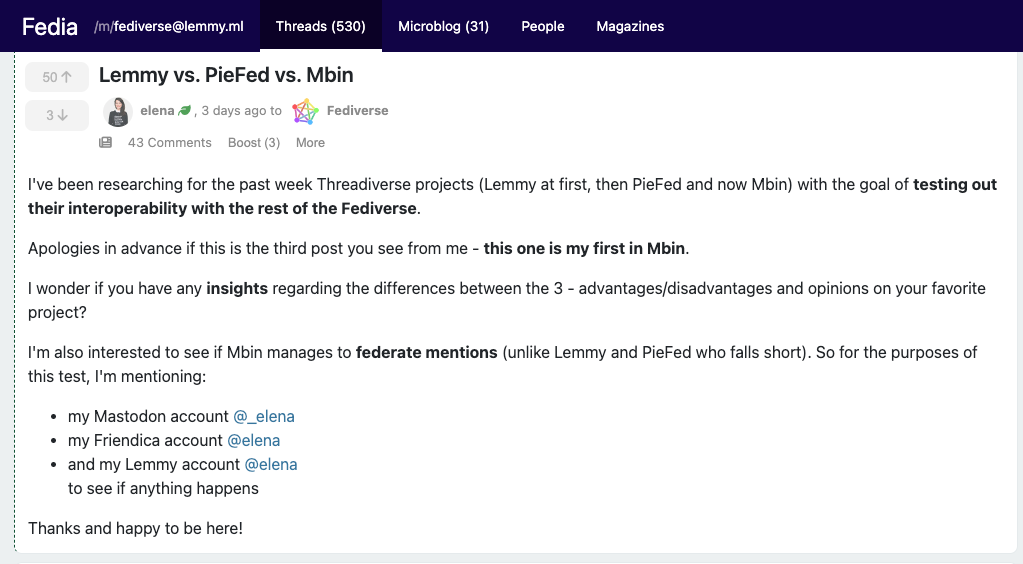 While Mbin was superior, federating mentions in the original thread (unlike Lemmy or PieFed), the federation of reply mentions was similar on Lemmy and Mbin (with Lemmy performing a bit better in this regard).