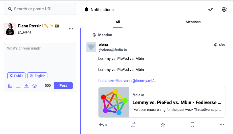 Why is this interesting? Because if you publish a post on a content aggregator and tag your Mastodon account, you wouldn’t have to waste time logging onto the content aggregator to catch up on comments – they would appear as notifications inside Mastodon. (Please insert a giant asterisk here because as you will see this only works with one particular content aggregator for now). Still, it’s an amazing time saver to be able to engage in discussions hosted by a content aggregator from a microblogging service of the Fediverse. It feels revolutionary.