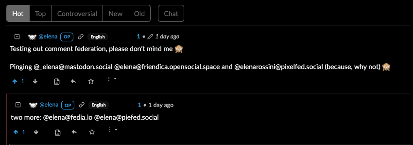 I ran the exact same test I did on Lemmy: a new post tagging my Mastodon account and also my Lemmy account, to see if federation worked across content aggregators. You can see it here: https://piefed.social/post/203443